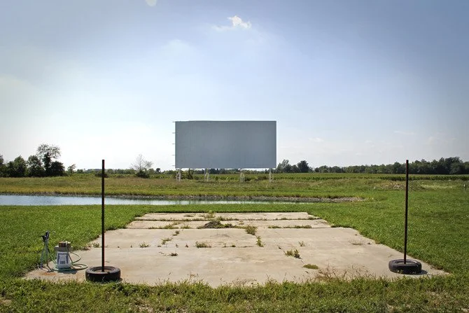 The remains of a Drive-In Theatre in Decatur Indiana. The screen overlooks a man-made pond built for a local church that separates it from the foundation that once held the projector and snack bar.