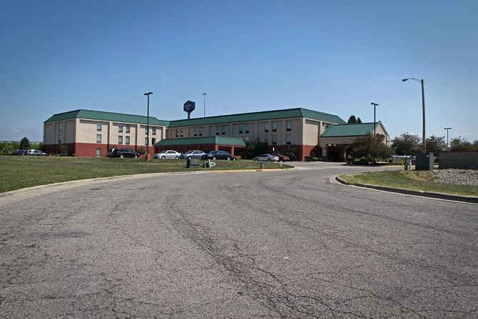 Dayton Executive Hotel. Boarded up windows, dead plants and all.