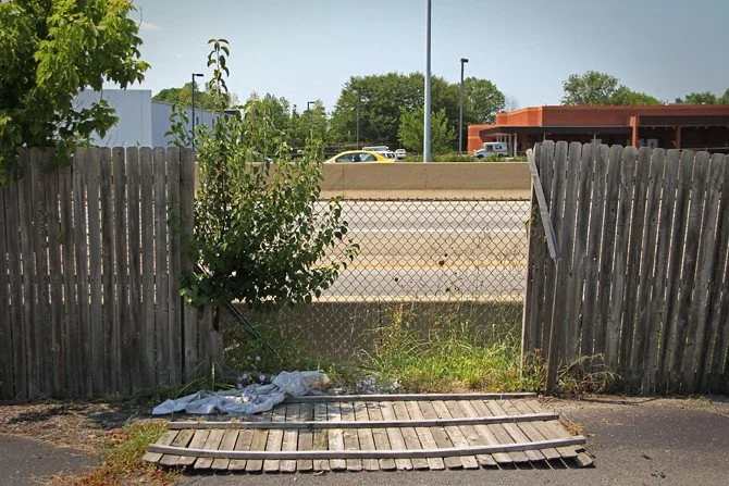 Collapsed fence shielding I-75 from the parking lot of an abandoned Dayton hotel.