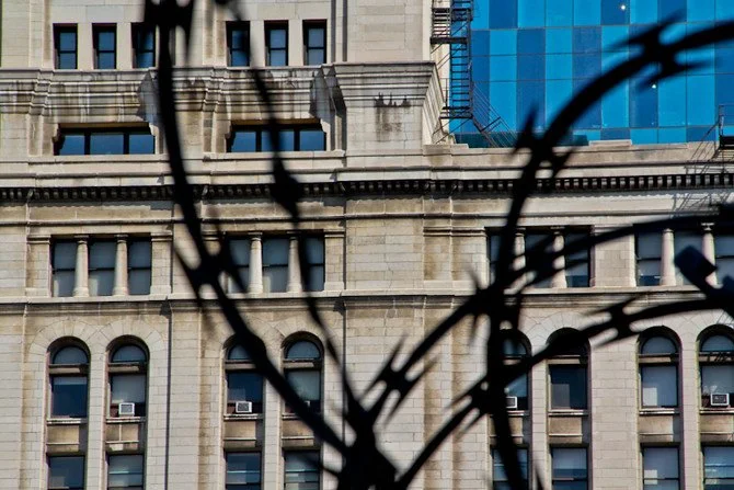 Chicago as seen through the grating of Comiskey's upper deck.