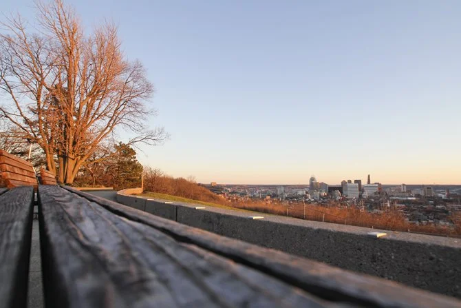 The city is a stark contradiction. It's loud, busy, exciting and crowded. The urban environment is a crowded concrete jungle that Andy Griffith wouldn't understand. Small town America is nice, but cities are the country's core. There's a spot though in Cincinnati where the idea of a postcard-esque small town meets that of a metropolis' skyline - atleast in a visual sense. When the sun is just right in the evening sky, that place is Bellvue Hill park.