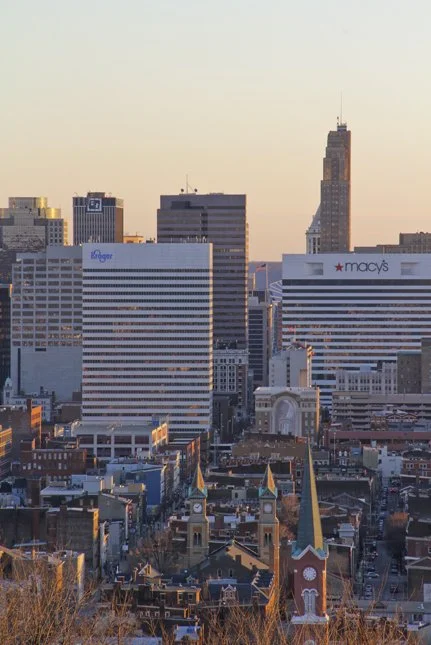 But what makes it a postcard town view? For me, it just happened to be the right time of day with the setting sun shining on the right features. It evoked that romanticized "Anytown USA" feeling with the neighborhood church steeples below, but had the mixed in elements of the urban OTR neighborhood and of course - the Cincinnati Skyline.