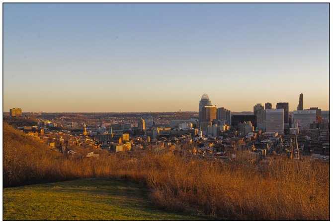 Walking a little farther off the regular path, I framed up three elements. The grass and leaf-less trees of winter, the urban neighborhood and the skyline. Combined with the setting sun, to me, it evokes a "Postcard Town" view of Cincinnati.