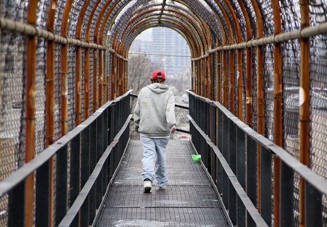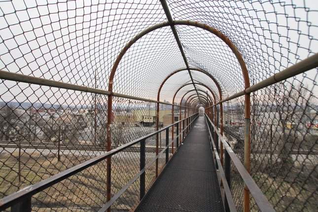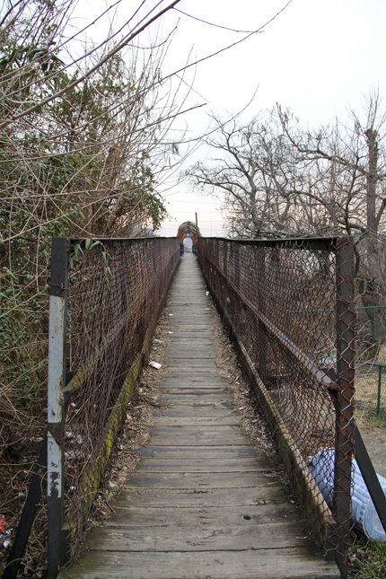 It's rusty, the fence is torn in parts and graffiti abounds. Nothing artful, just a bunch of swastikas and names written into the metal. Potato chip bags, pop cans, beer bottles and other trash line the sides.