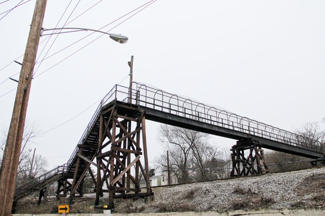 The bridge is unique in that it doesn't really mirror or look similar to the pedestrian bridges around the area. The supports are made of wood as opposed to concrete. Maybe it was built by the railroad?