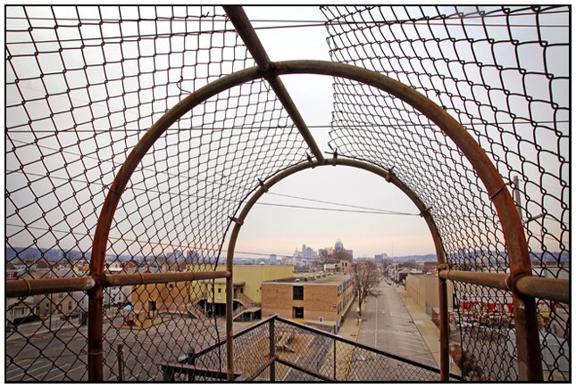 The bridge is certainly an oddity. I've never seen anything that looks like it in the city or surrounding area. It seems like some obscure rural crossing that would be more fitting in a "small town." Its gritty appearance and Midwestern charm certainly add to the "tough" quality mentioned before. As you reach the end of the crossing, the city of Newport, KY lays ahead of you while the rusty suicide fence frames the Cincinnati skyline, viewable off in the distance.