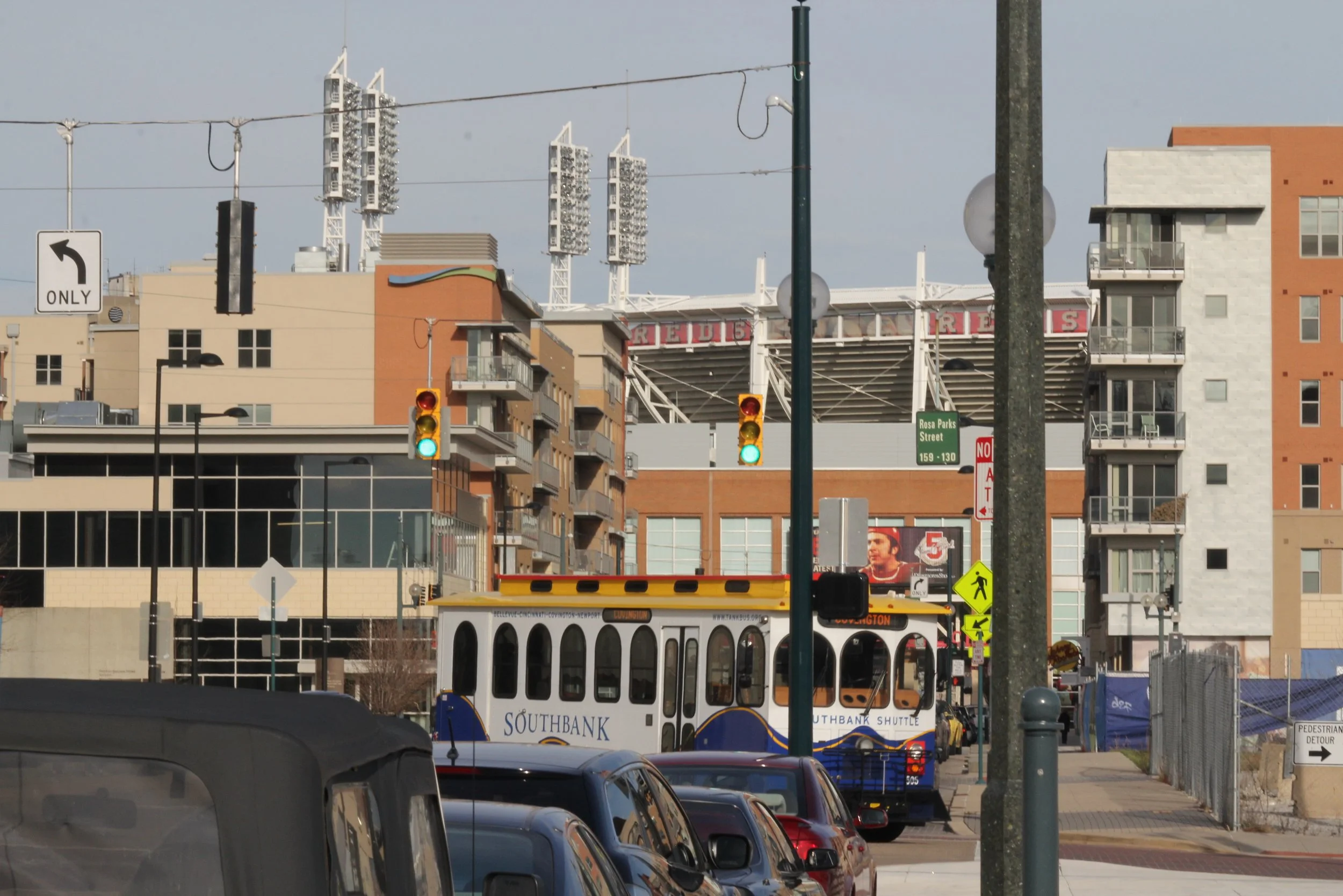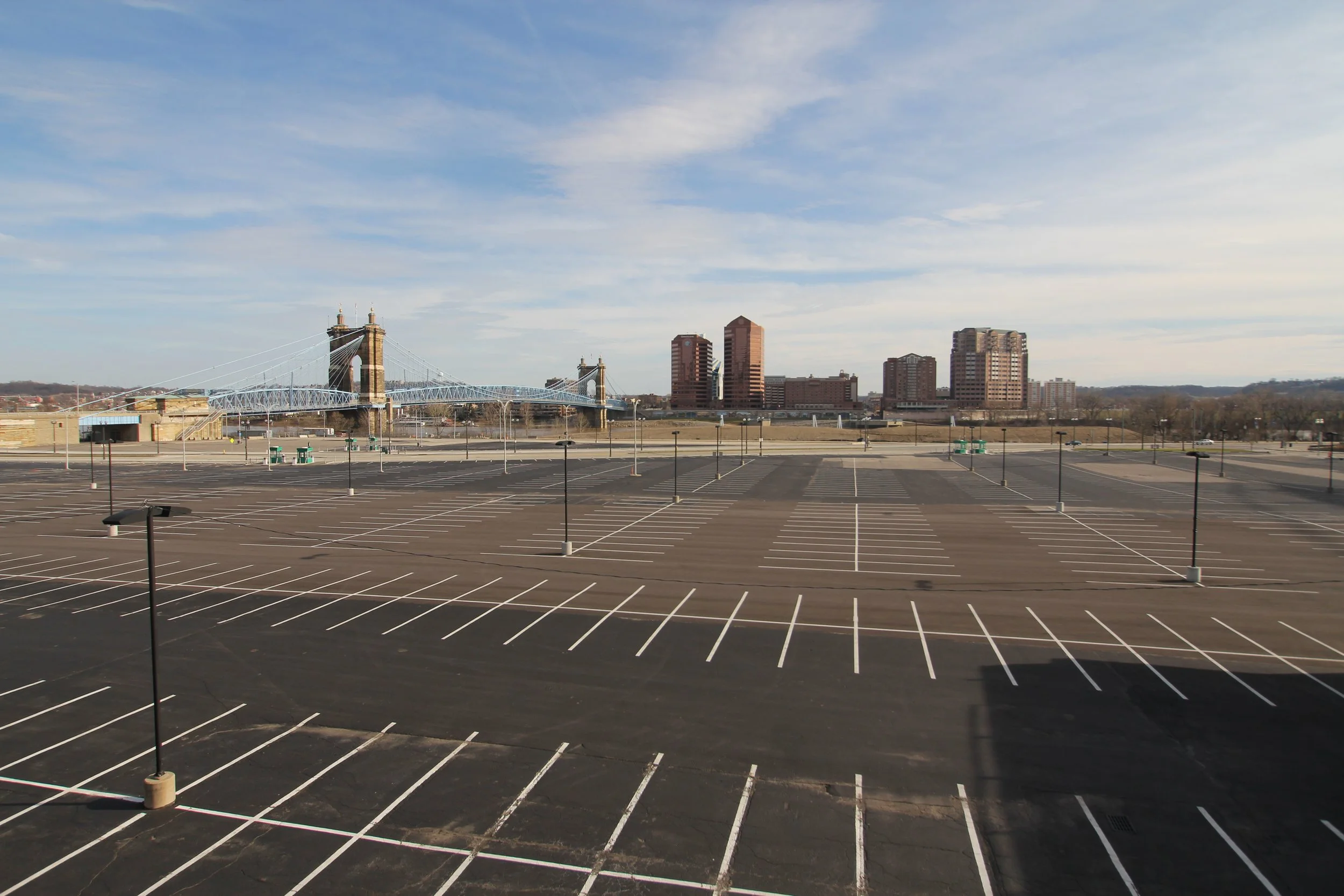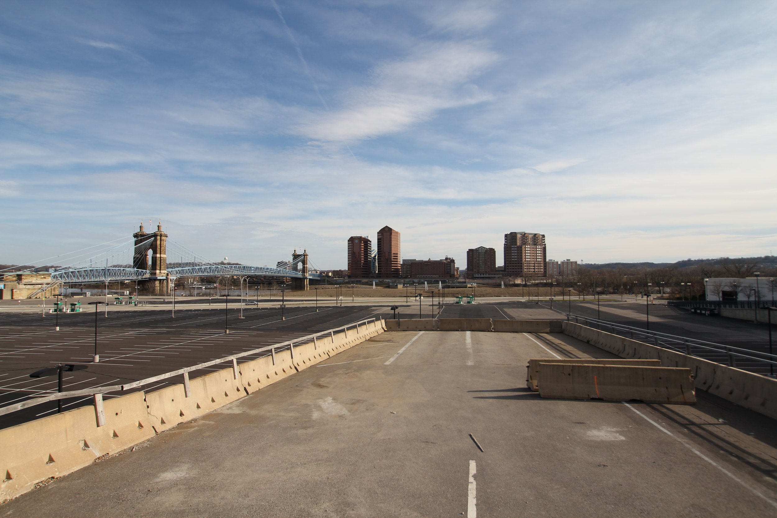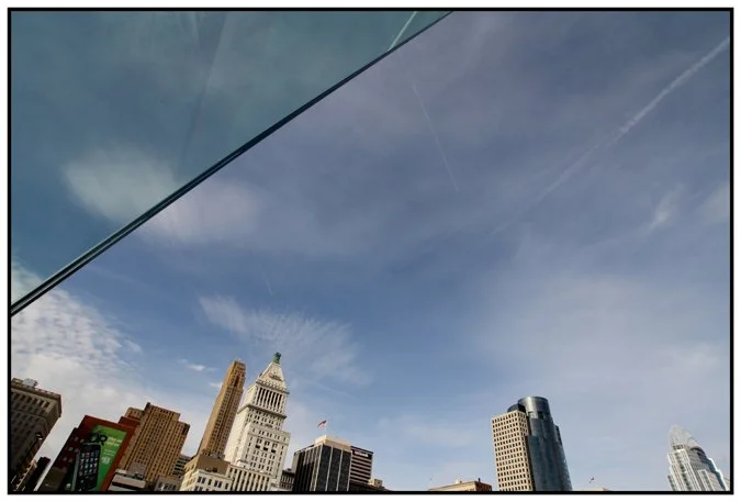 The Big Red Machine used to play nearby, their stadium gone. In its place: new development - a resurgence of the riverfront, an extension of the city. It all looks up to the line of skyscrapers that cut into the sky along with the clouds and contrails of airplanes. The riverfront uprising offers its own jagged edge in the form of glass.