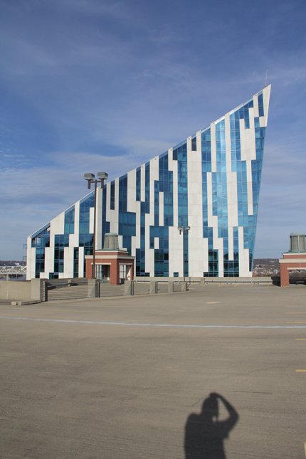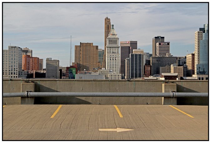 A view from atop the Covington Transit Center parking garage that appears directly South of the Carew and 4th and Vine buildings. Normally views from Kentucky feature the river in the foreground. Not here. The river is replaced by the concrete wall and its piping, the rusted copper of the lightning rods has begun to leave green stains on top of the wall and the markings on the ground point Eastward.