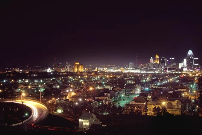Cincinnati is named after the Roman hero Cincinnatus. Just as Rome is surrounded by seven hills, so is Cincinnati. Those seven hills on the Ohio side are quite well known, but even across the river and in another state, there are hills that surround the Queen City. If you didn't know any better, you'd think the neighborhoods of Newport in their expanse between the white lights of slowly passing cars and the downtown skyline of the frame above, were still part of the city and not in another state entirely.