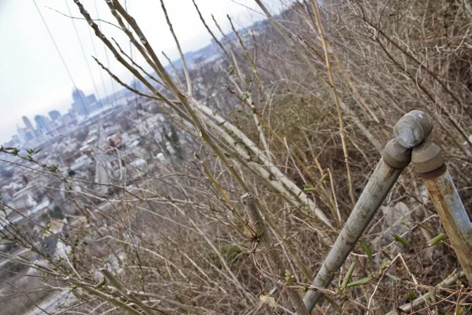 Clearly there had once been some sort of path for the abandoned stairs here. Was it an overlook at some point? I don't know. Even with its overgrown and unofficial status, we weren't the only ones out shooting photos here. Just down the hill, a couple parked their car and broke out their cameras while we had ended up meeting with three more of our own photograph friends - everyone using a similar vantage point to that Cincinnati Magazine photographer in Nineteen Eighty8.