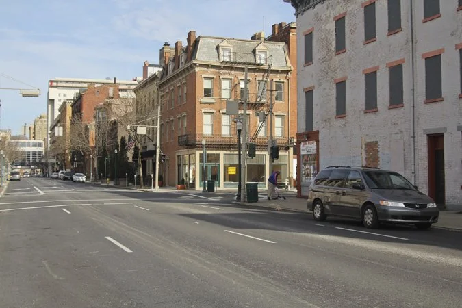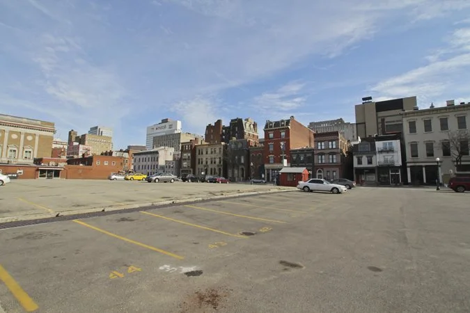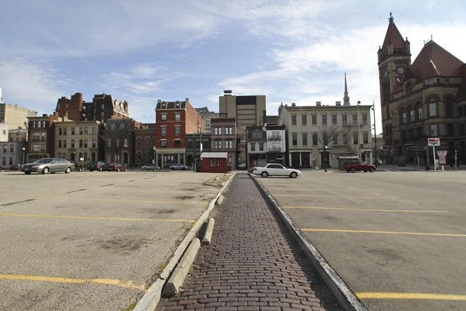 Ugly surface lots broken up by the cobblestones of an alley that used to cut between buildings.