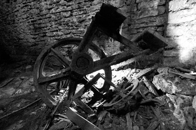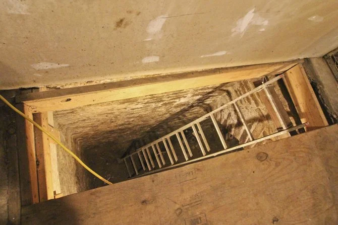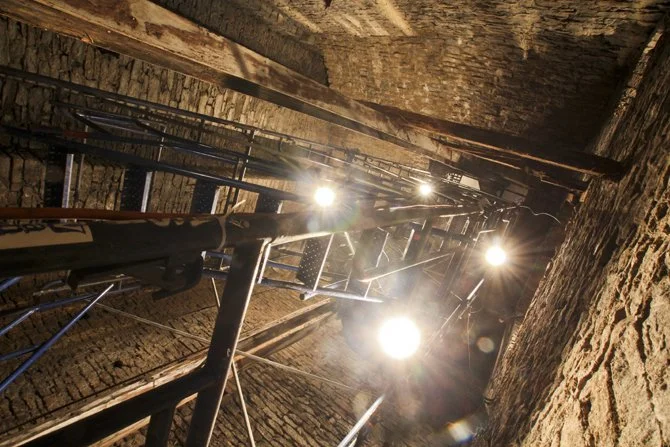 The temporary metal stairs were retrofitted into an elevator shaft, the mechanical remains of which could be found on the floor.