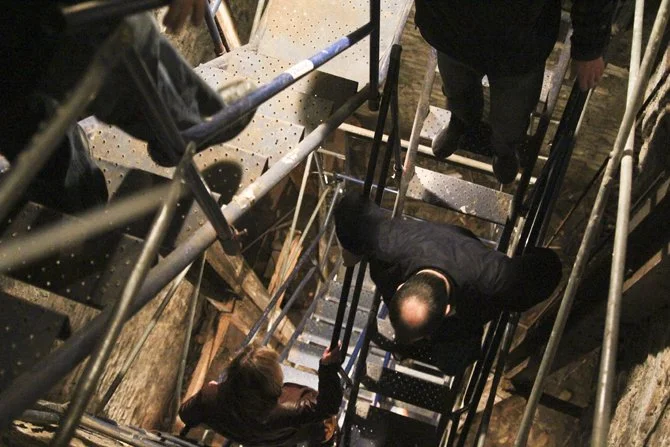 A 40 ft. scaffolding staircase descended into the depths below.
