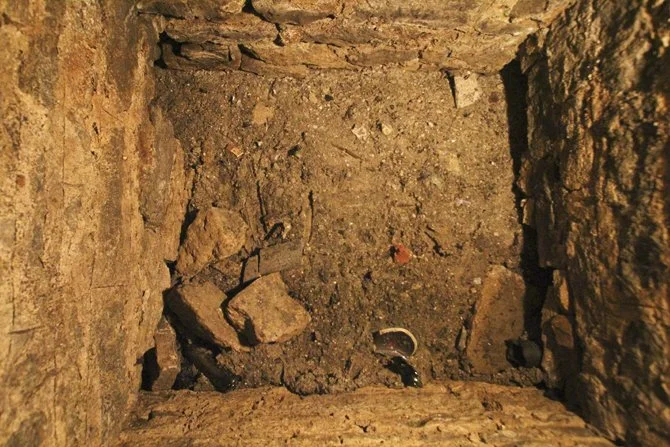 Looking up one of the tunnel shafts you can see old bottles buried in the ground.
