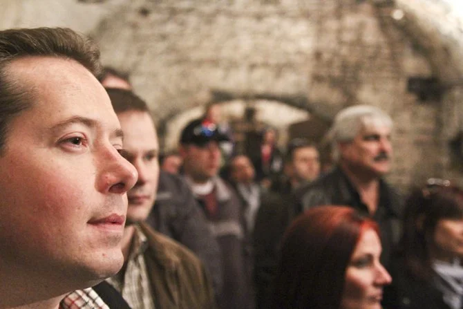 We walked from Bockfest Hall to the former Crown Brewery first. Entering through the garage, you descend stairs into the stone tunnels below and can see the lagering cellars before traversing through a tunnel beneath the street to another building.