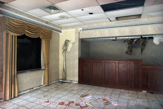No one in our group of explorers knew what had caused the flooding. The ceiling was totally gone in some areas, could it have been rain water? Broken plumbing? The crumbling billboard out front advertised convention rooms, but we didn't see any. Perhaps they were downstairs, but we'd never know if they were - or what else was down there for that matter.