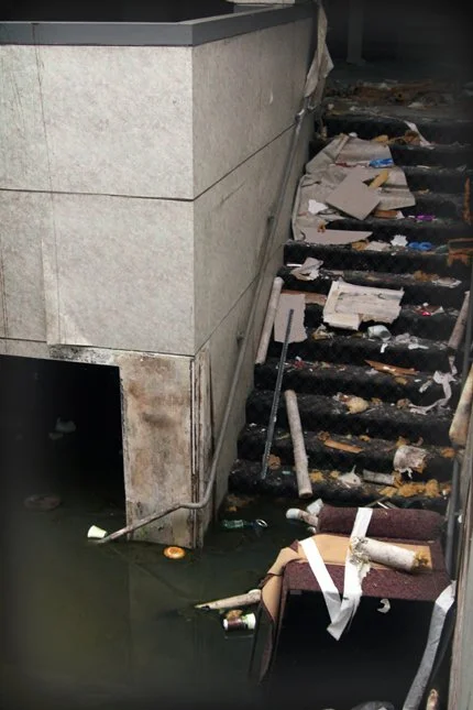 I don't know if you could call these lobby stairs grand, but just like the "Grand Staircase" on Titanic, this one is also covered in water. It's hardly a welcoming site for guests at the lobby check-in, but any guests the Dayton Executive Hotel sees these days aren't of the "normal" variety.
