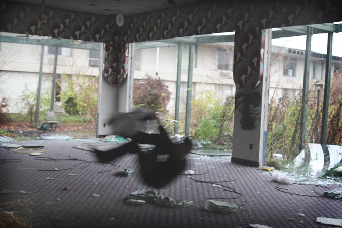 Trap pointed out gang symbols spray painted on the fence surrounding the hotel's abandoned parking lot. He also warned us that when his crew had been here before, they had seen signs of people squatting there. Not that a squatter would intend to harm you, but better just to be alert anyways. The place was in total disrepair. As I mentioned before, even from the nearby highway you could tell the hotel was abandoned. Boards had fallen off the windows they were meant to protect and a loading dock with a ramp down to the basement was filled with water up to the parking lot's level, a preview of what was to be seen inside.