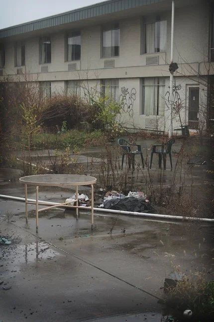 I'm not sure how all the garbage accumulated. The entire place is trashed, but the stairs are especially. Vandals? Scrappers? Hobos? Who knows. Back then, we were guests on a cold, rainy afternoon. Unlike most hotel visitors, we weren't looking for a place to stay for the night. We were just there to check it out - photograph it, document it.