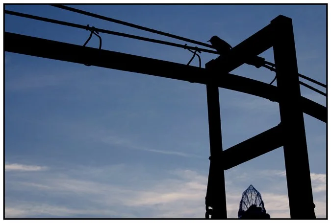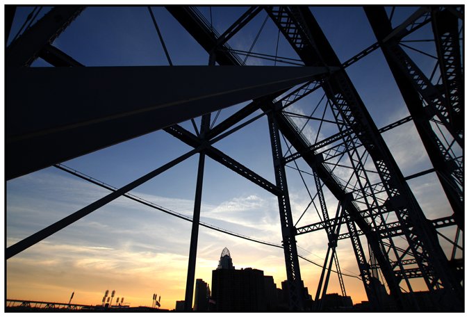 A bird relaxing on a support for power lines at the Purple People Bridge that frames the highest point of Cincinnati's skyline. NOT a promotional poster for that shitty Mel Gibson action movie.