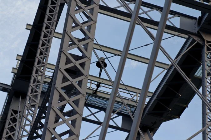 A "Pennsylvania Petit" style truss on the Newport-Southbank Bridge silhouetted along with the Skyline in the distance.
