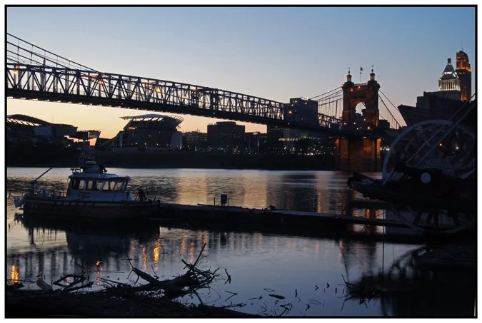 I got in the car and drove down the parkway as the sun was setting. Adjacent to my apartment there was a nice skyline shot, but I decided to keep going. I never take the direct route to Covington. I always cross the Big Mac and get off in Cincinnati on 3rd. St. Then I cut over to the Roebling and back across the river. I drove down to the Covington riverfront. I decided to drive down by the shuttered Mike Fink's, a docked riverboat turned restaurant that is indefinitely closed. Docked on its pier is the Covington Fire Department's boat. They're the two of three boats docked on Covington's shore - the "fleet" if you will. The third boat is another closed floating restaurant down river. The only active boat in the armada is the fire boat.