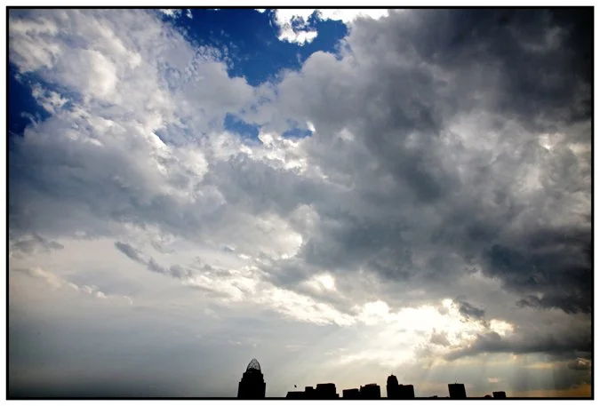 It was the first Friday night that I had off in a long time. Naturally, I wanted to go out and shoot photographs. Glancing at my cell phone, the forecast looked nasty. As I left work that evening, the clouds started rolling in. I ditched the I-71 South traffic and took local roads to Columbia Parkway. Up ahead I could see the clouds rolling in, but the sunlight was still shining through those same clouds on the Skyline below. I drove up to the parking lot of the Celestial Restaurant in Mt. Adams, a more "touristy" view. I had been wanting to save that spot. On one hand, it provides an easy and more traditional view of the Skyline - but I had been wanting to catch it when the light was just right or something unique was going on. The inclement weather provided just that as I got there in time to see the last of the blue sky before the incoming thunderstorm took over.