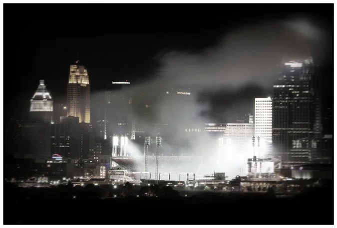 I sat on a hill across the river, in another state, listening to the game stream through my cell phone. I stared across at the lit up stadium as the Reds went down. Then the stadium lights cut out and the broadcast ended. I listened to some music, the camera was all set up. Two kids came climbing out of the woods below me. "See! I told you it was a good view" says the boy to the girl. Finally, the sky begins to explode and the city sounds like it's being shelled by colorful artillery.