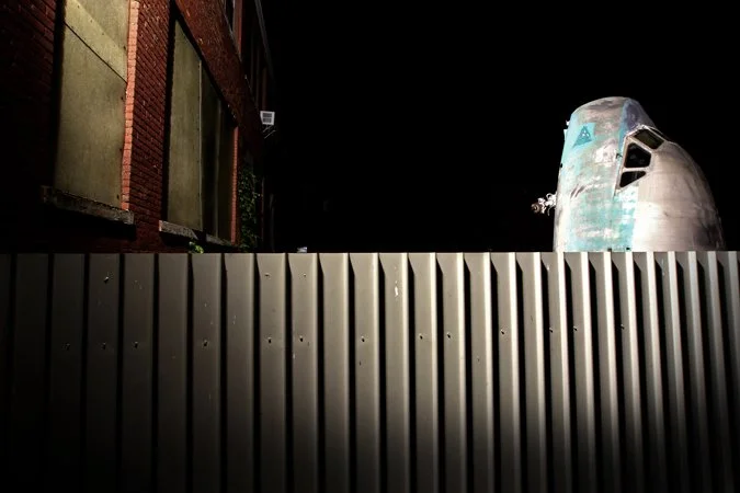 Ryan Texas Ranger and I were giving our friend Barth a tour of the city last night when we drove by an aircraft fuselage sticking up over the fence of a recycling plant. This could be used to make some pretty cool art. Wonder how much it costs or if the company who owns it would let me photograph it up close? If you have any idea what kind of plane this is, leave a comment or shoot me an email.