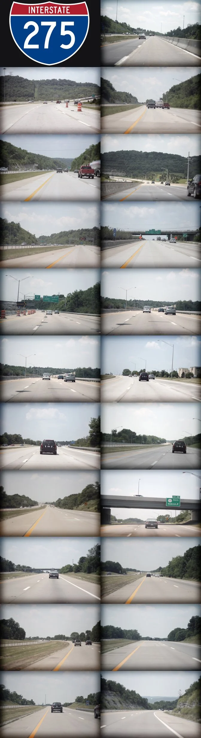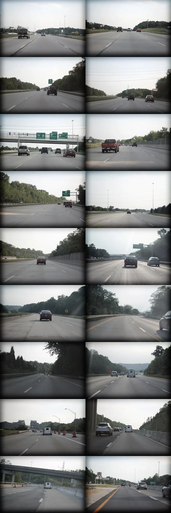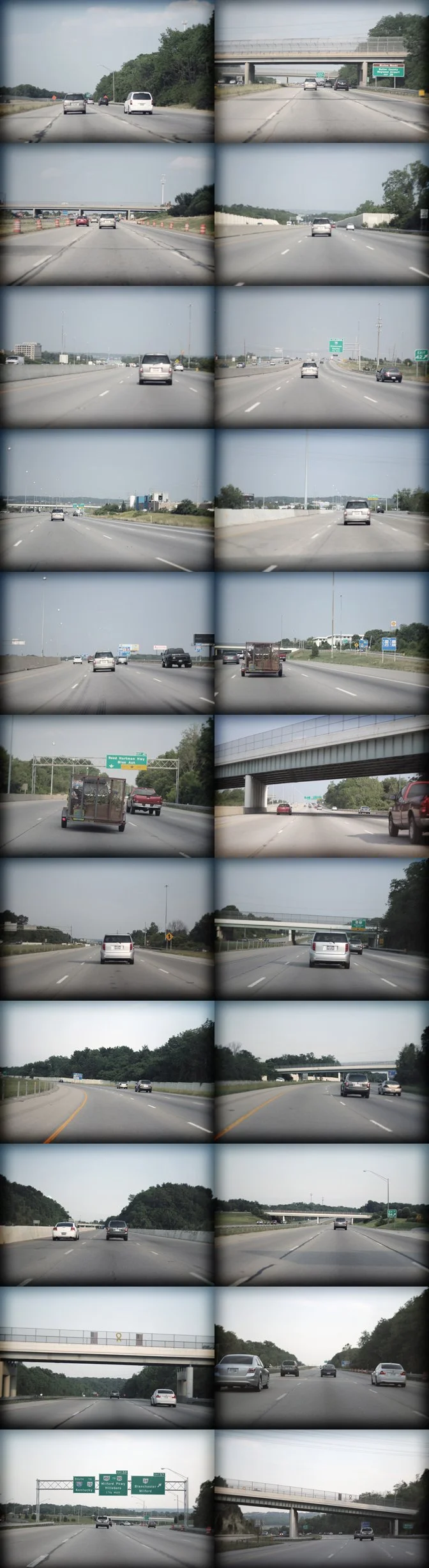 A photo snapped yesterday at every mile marker along the 83 mile Interstate 275 that traverses Ohio, Kentucky and Indiana around the city of Cincinnati. A quick glance offers monotony, but if you look closely in each snapshot you can see the little details that set each individual mile apart.