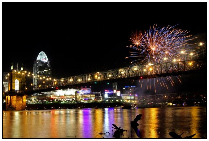 Fireworks exploding over the Ohio River behind the iconic Roebling Suspension Bridge during a "Fireworks Friday," a summertime post-game promotion by the Cincinnati Reds Baseball Club. Photographed while standing on some debris in the river.