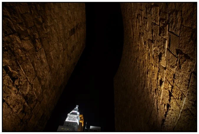 A slim view of the Skyline at night, framed by the stone walls of the National Underground Freedom Center.