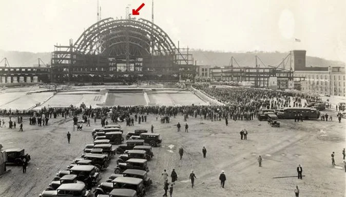 The "high steel" tour is one that's available to the public, but camera's are not permitted. This is for good reason, if you drop your camera you may as well yell goodbye as it falls through the steel maze below you. To give you an idea of where in the building we're at, look at the arrow in this construction photo: