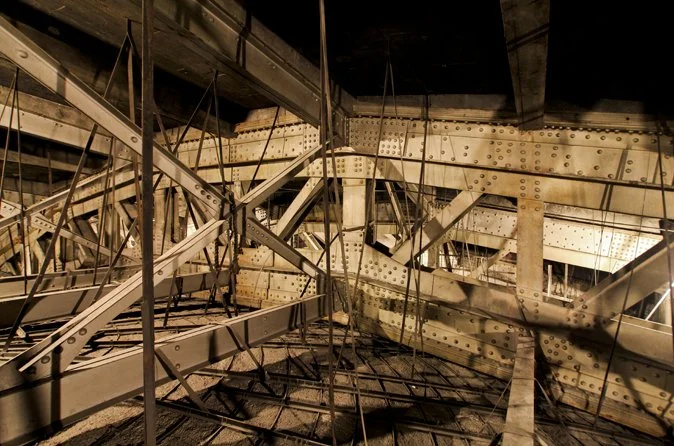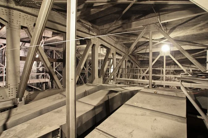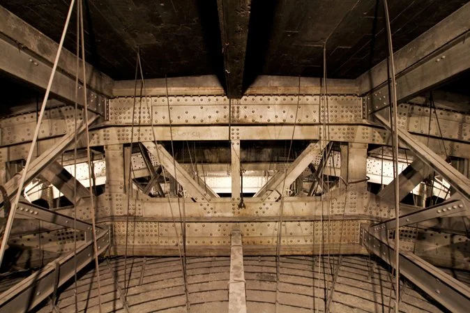 The top photograph is the building's rotunda, below is a photograph of the steel structure accessed by catwalks above the dome.