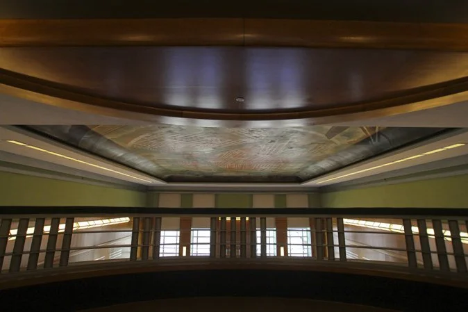 The mural above The Cincinnati Room depicting the era's four main modes of transportation and the urban street grid.