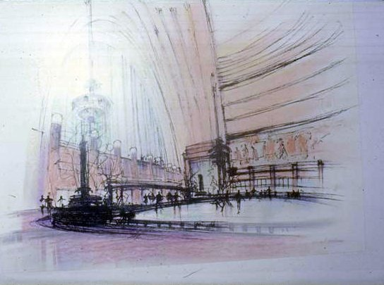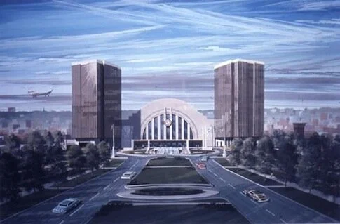 Many different proposals and ideas were considered for the terminals future. None of them (including the garish office park idea seen above) came to fruition. It wasn't until 1978 that the terminal had a new lease on life. A Columbus, Ohio developer began turning the historic building into a shopping mall. When completed in 1980, Union Terminal reopened as "The Land of Oz," a family entertainment and shopping complex.