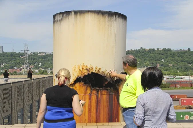 Accompanied by the center's social media coordinators Lauren (aka Miss Print of Cincinnati Rollergirls fame) and Natalie, Steve leads us to a glass catwalk. We're now standing in between the two sets of windows on the building's main facade.