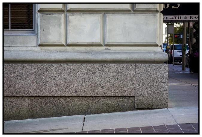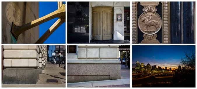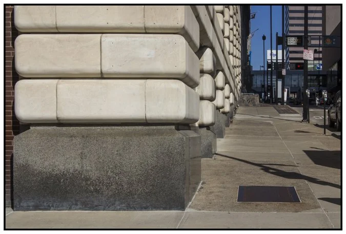 In regards to shooting wide - I decided to make some frames in the series that focused on details of the buildings that make up the Cincinnati skyline. I've done some similar ones before - using a large telephoto lens to zoom in on the tops of the buildings in somewhat abstract compositions. However, until yesterday I never thought to look below. Even though these details can't be seen from far away or towering over the landscape, they're still part of the skyline - supporting it and holding it up.