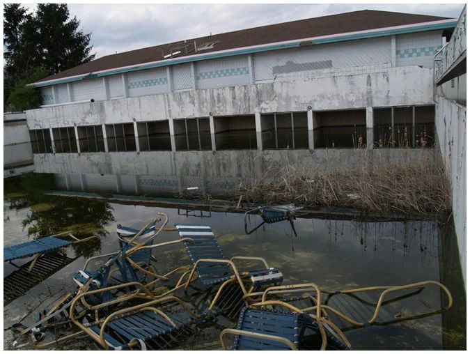 The wave pool attraction Surf Cincinnati filled with standing water and discarded lounge chairs.