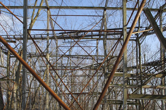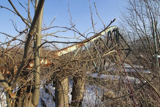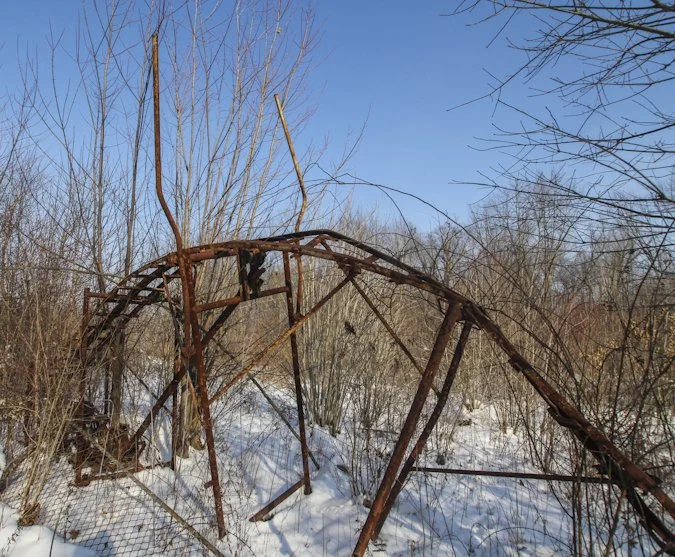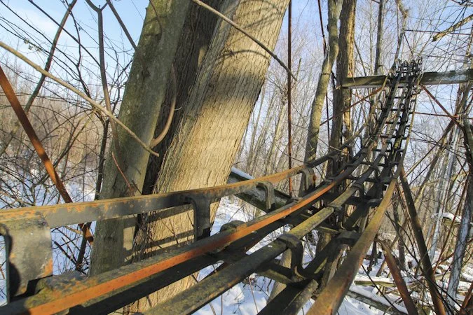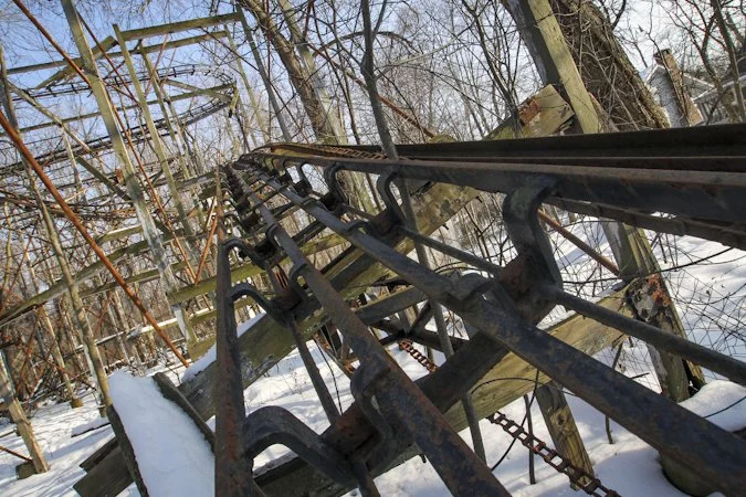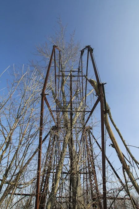 As nature reclaims the land on which the park was built, trees have even begun growing through and around the coaster's track. Through the rusted remains of the roller coaster, a tree grows in Chippewa: