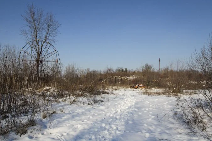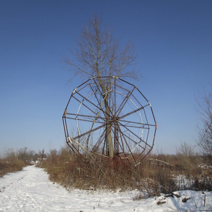 Finally we came upon what has become the definitive icon of Chippewa Lake's abandonment: the ferris wheel. The tracks in the snow were clear, we weren't the only ones who made the trek to see the forgotten park and in nearly forty years of being abandoned. Not to mention, several other people have been here and shared their photographs all across the internet. The park's rusted out ferris wheel with a tree growing through it has become the photograph everyone seems to take when they go here. We were of no exception. The symbolism of the object speaks for itself - the park is dead and nature is reclaiming the land, rising through the rust and deterioration of humanity's remnants.