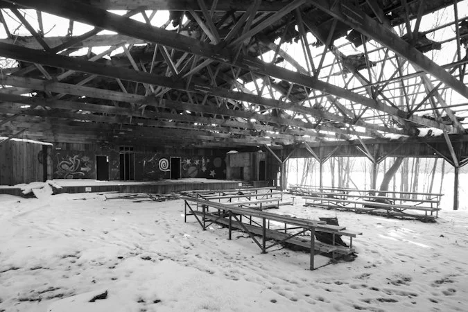Still somewhat visible to the neighborhood, we quickly moved from the coaster in people's backyards to the rest of the park. We came across a building right on the edge of the lake. What this place had been used for, I haven't been able to find out. However, there seemed to be a small wooden stage at one end with bleachers stacked in the middle. Had we gone through with crossing the ice, this would've been the first place we came upon.