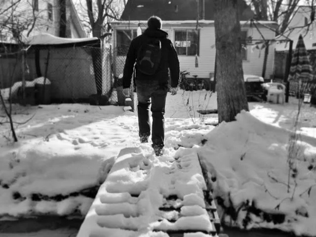 We found a place to stash our vehicle close to the park and where we had access to the lake. The docks that once anchored boats in the summer, had temporarily been removed and the ice was dotted with footprints and skate tracks. We were still in plain sight and nearby vehicles would pass by and park on the shoreline, facing right in our direction. I repeatedly made Paule and Cody Jay pose for stereotypical portraits until the vehicles left and we could resume our hike across the ice.