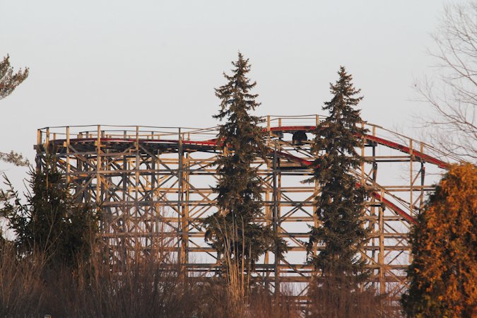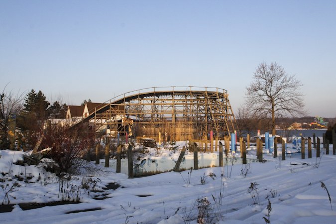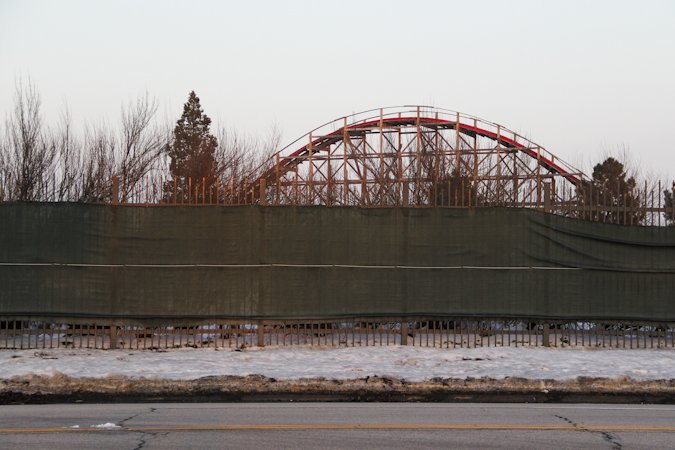Cedar Fair began shipping out rides to other park's in its chain. Most of what wasn't worth moving was demolished save for a few rides. The park's closing thoroughly upset the local population. Preservation efforts were set in motion to try and save the park's 1925 "Big Dipper" roller coaster, but those plans ultimately fell through. Today, a few buildings and the Big Dipper still stand, their future unknown. Upon our recent drive-by visit, The Raging Wolf Bobs was in the process of being torn down - the salvageable wooden timbers being stacked nearly behind a barbed wire fence.