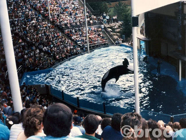 A large crowd watches killer whale "Shamu" at Sea World Ohio.