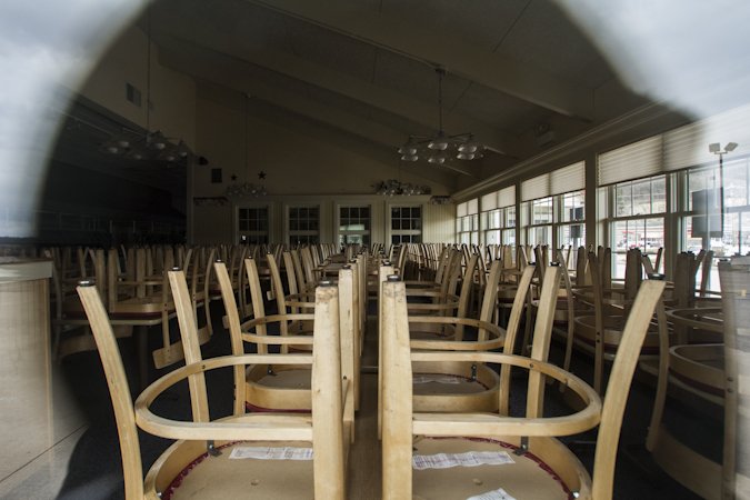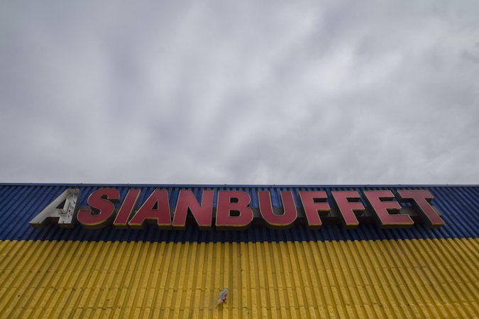Adjacent to the "Asian Buffet," an abandoned "American" Buffet once known as a Golden Corral with the chairs neatly stacked atop the tables.