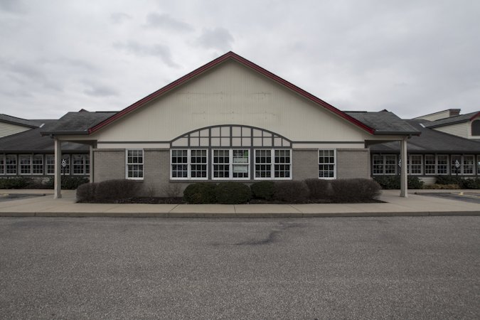 An "out" sign in Frisch's Big Boy branding still in front of the buffet which was repainted after it ceased being a Frisch's.