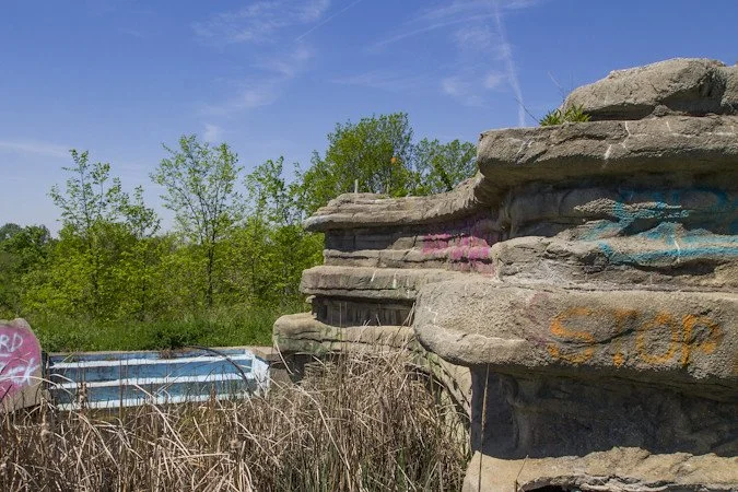There wasn't much left of Thunder Island when we were there. In the day and age we live in now, waterparks are typically found at corporate backed theme parks or feature ultra high-tech attractions. It was hard to judge what a lot of the attractions here once were. One of the pools had piers and a piece of a now rotting wooden dock. We assumed it once lined the whole thing, with a fountain in the middle.