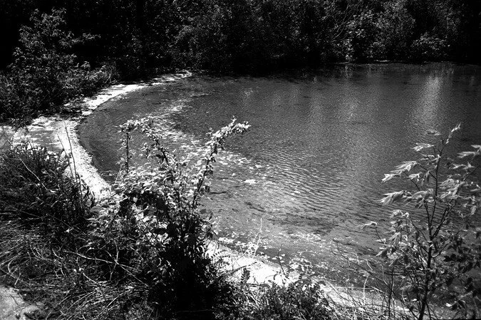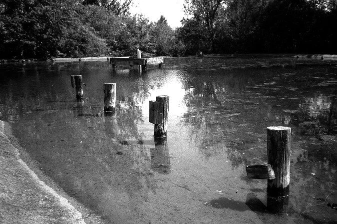 Towards the back of the park was a large, L-shaped pool. How deep it was, we had no idea. The water is too murky and even in the areas you can see down, there's too much vegetation growing down there to see the bottom.