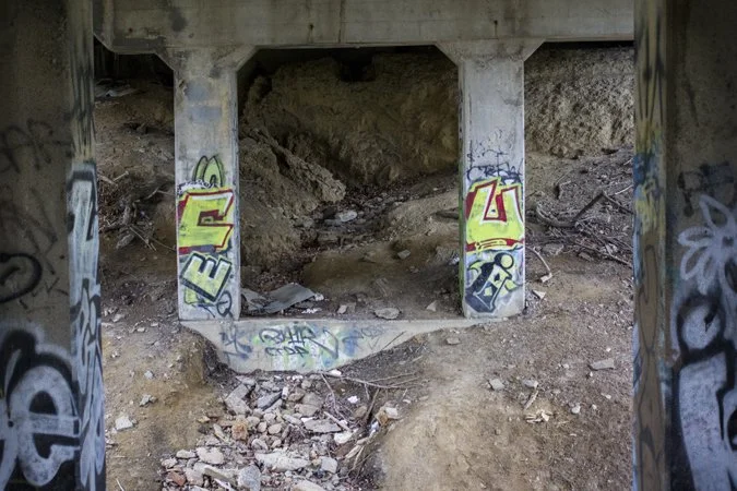 It's a gray and cold Friday afternoon, but the rain's holding off. We parked the car on a side street not too far from where we saw the abandoned tracks. Cutting across a condominium parking lot, I watch Cam go first down the embankment. He makes it down with ease, but I'm not so lucky as my ass slides through the dirt and mud towards the unused railroad. In both directions the tracks go on as far as you can see, but immediately next to us is a roadway overpass, the underside of which has become an urban art gallery - a canvas for graffiti. Clear of hobos, we take a look around.